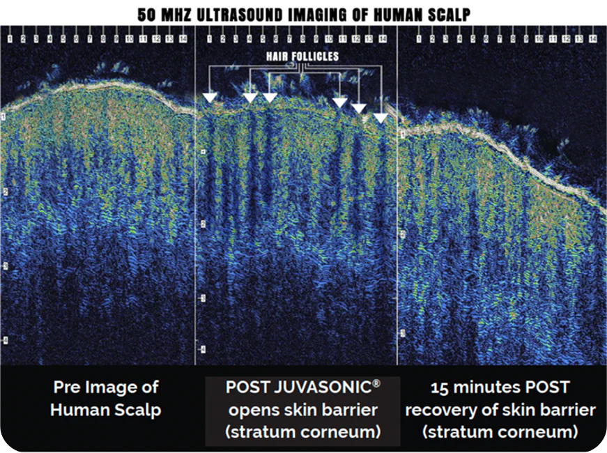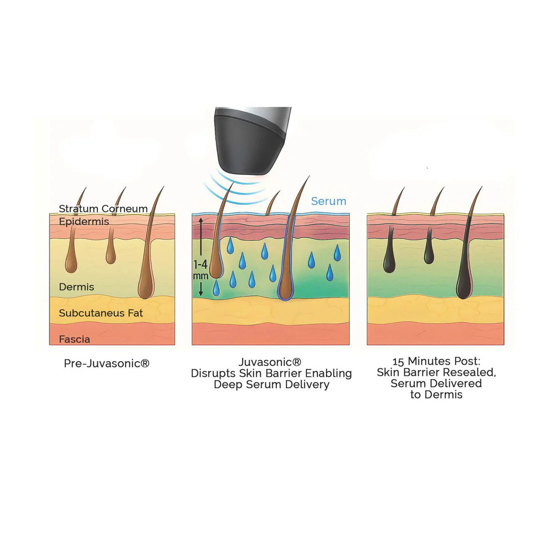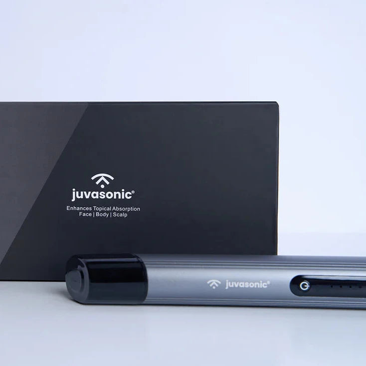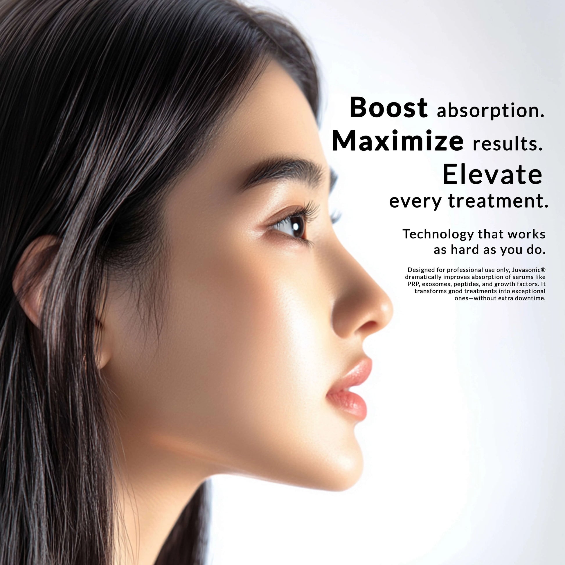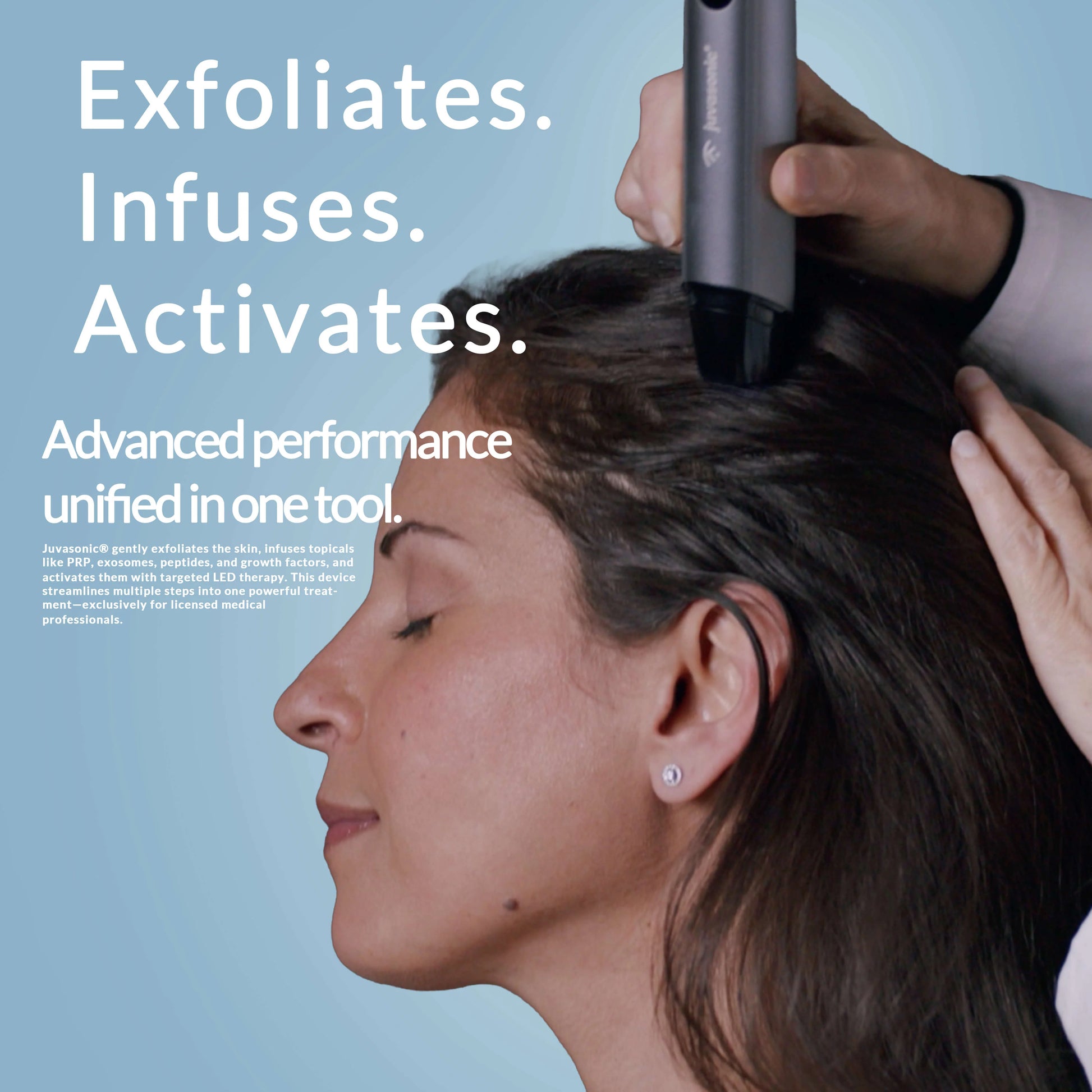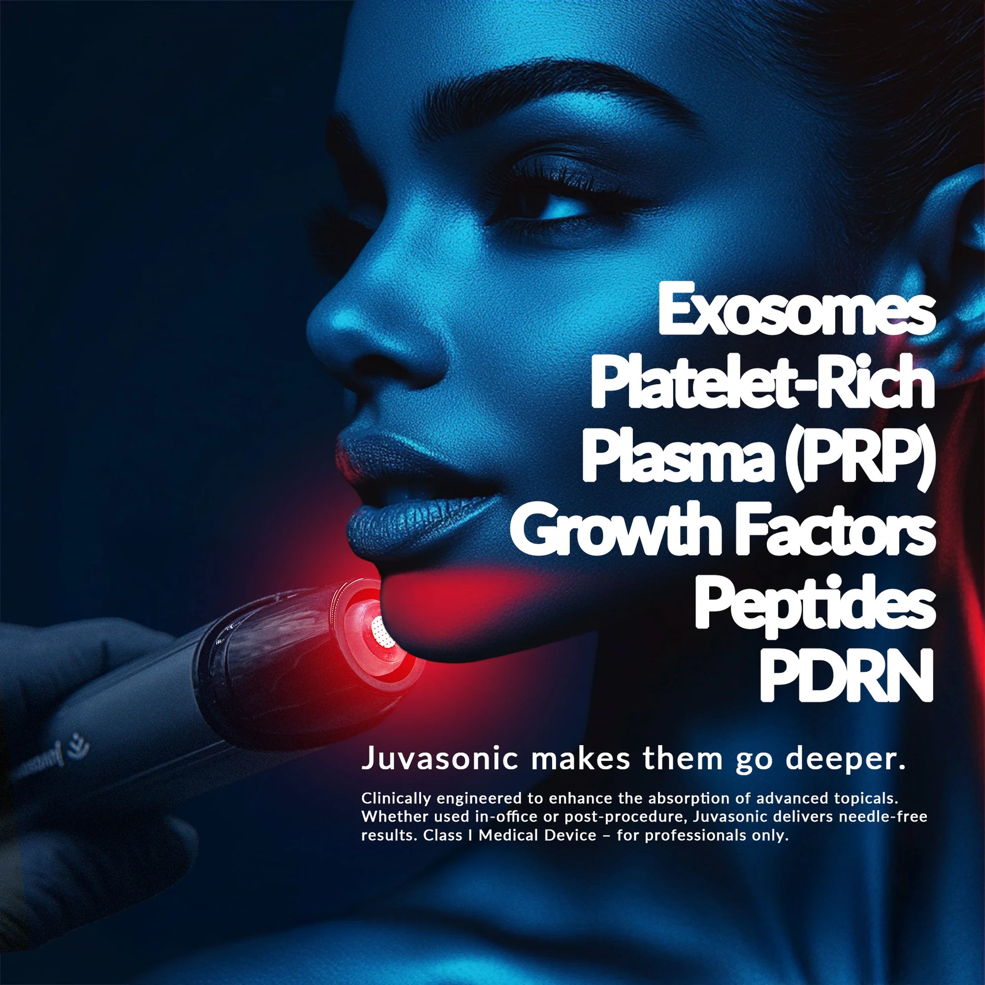 Juvasonic® is a professional use, FDA registered, Class I Medical Device designed to enhance topical absorption of exosomes, PDRN, PRP, and peptides. With precision-engineered microchannel vibration, microdermabrasion, and dual-wavelength light support, Juvasonic® is the first in-device, needle-free exosome system for use on skin and hair!